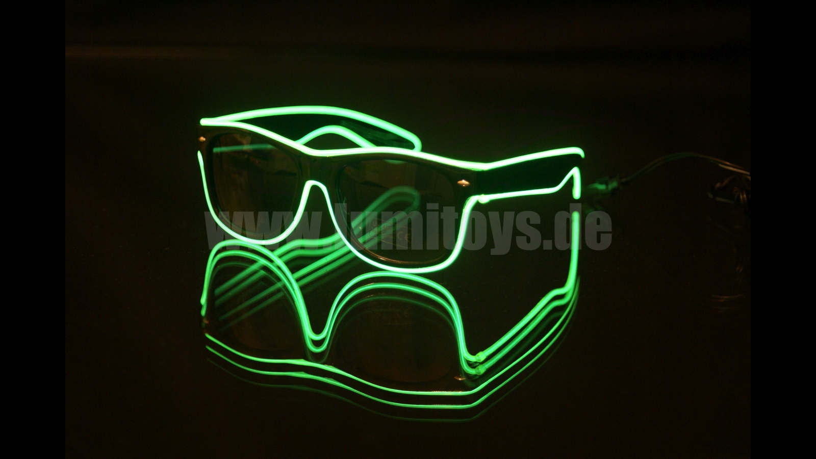 Glasses with EL-technology in different colours, various operating modes selectable by switch. Also available with sound sensor on request. 2x 1,5V Mignon batteries required (item 1921) NEW: Also available as rechargeable version (USB)!