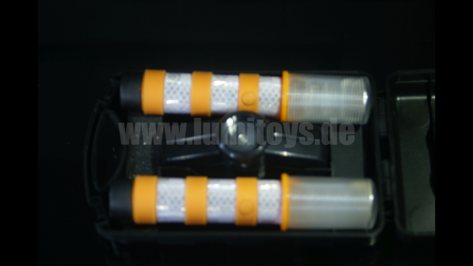 Battery operated emergency flares with additional torch function as optimized safeguard for additional protection from danger points. Maximized visibility by high power LEDs, direct fixing on metallic surfaces (i.e. car roof) possible by magnetic bottom. Attachable stands allow further positioning. Three operation modes (Warning function: red LEDs flashing or shining; torch function: white LEDs shining)