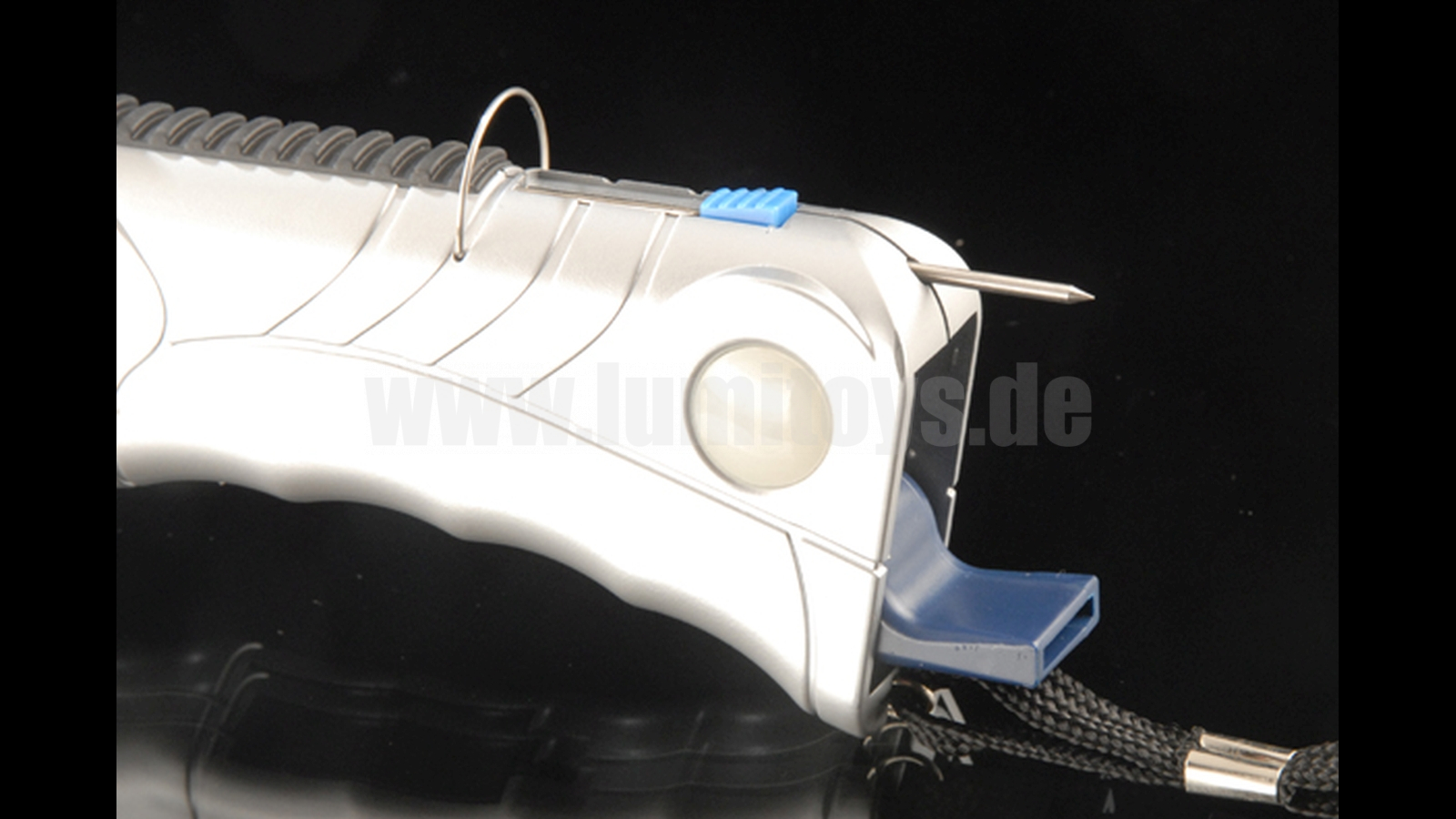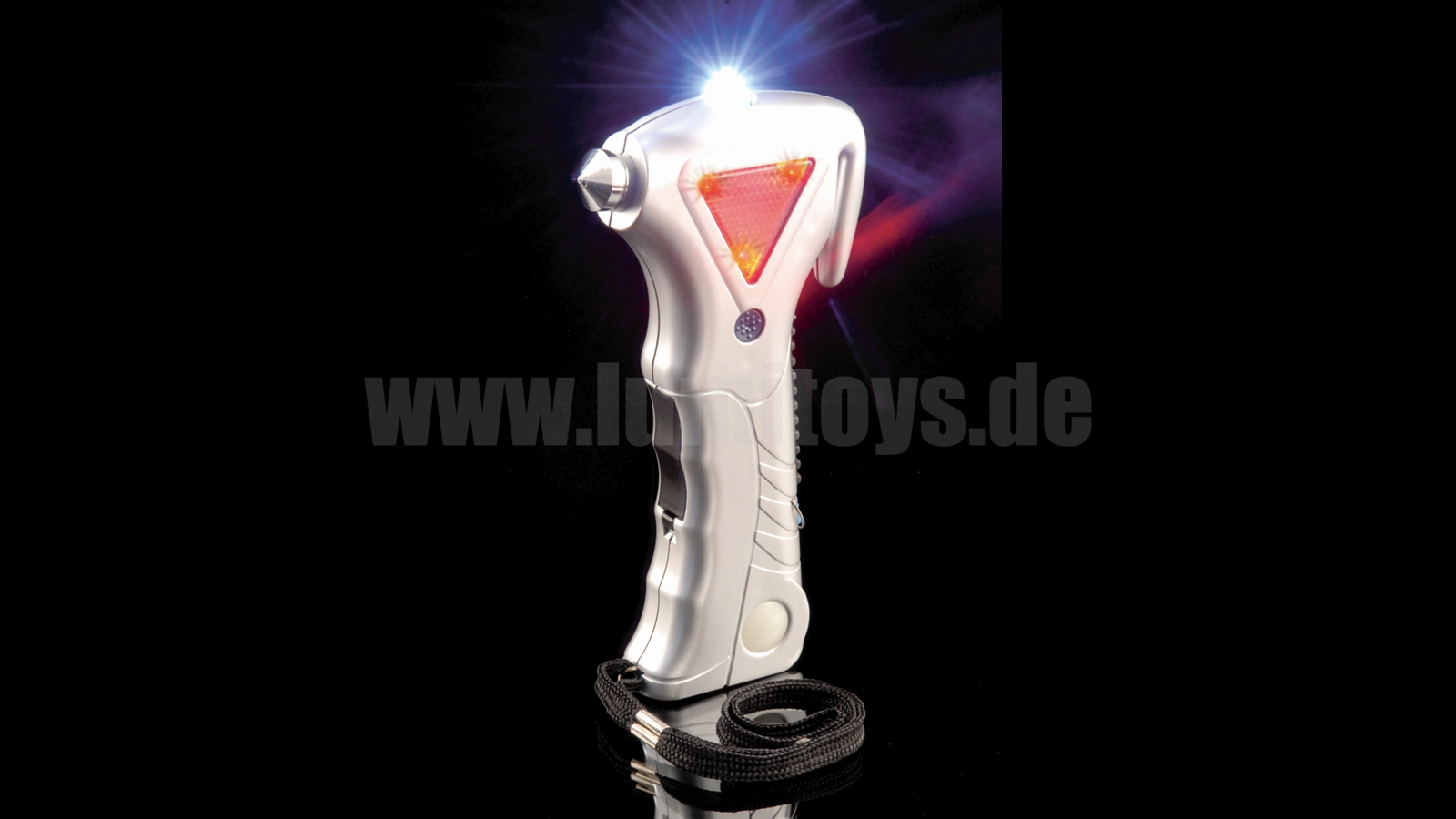 Multifunctional safety-tool with LED-light, flashing emergency light, emergency hammer, belt cutter, whistle and needle, battery operated. Various colours available, additional print is possible.