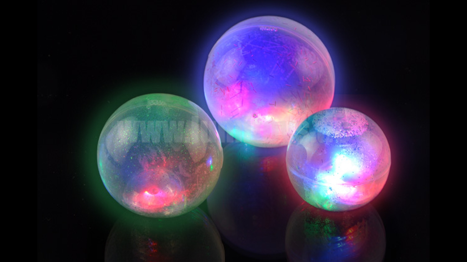 Bouncing ball with shock activation, filled with water and glitter. Different sizes, more LED colours available on request. Batteries included (not changeable).