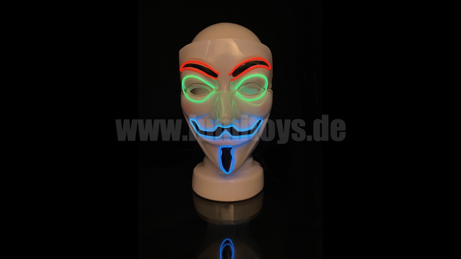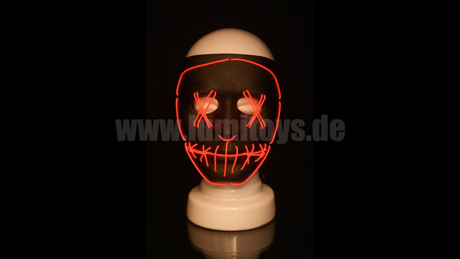 Flashing mask with various light effects, LED colours can be chosen. Fixed by elastic band. Item only on request!