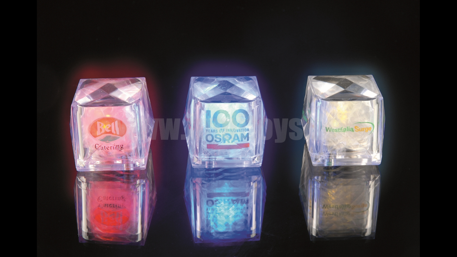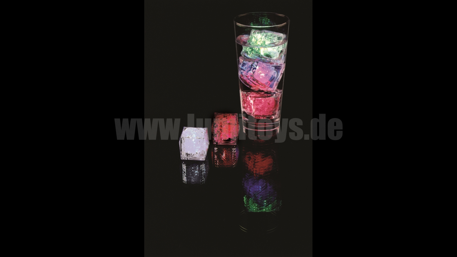 Flashing ice cube with foil for optical ice-effect, three flashing functions: slow, quick, shining. Waterproof or with changeable batteries. Delivery inc. 2x CR1620 batteries (spare: item 1948)