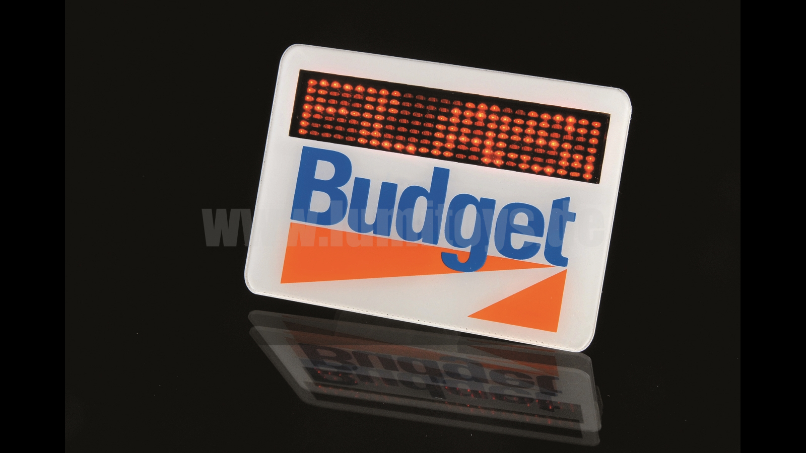 Programmable nameplate with 147 LED mega-display, needle and magnetic clip. Running text for self-programming or pre-programmed, up to 512 symbols. Capacity for 6 messages, brightness and speed adjustable. Delivery inc. 1x CR1220 battery (spare: item 1947), different LED- and body colours possible on request.