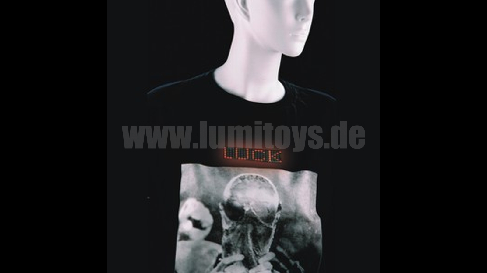 Individual t-shirt with integrated LED text up to 256 symbols. Running text for self-programming or pre-programmed (with or without programming function), various LED colours possible. T-shirt available in different colours, additional print on request. Sizes S - XXL.