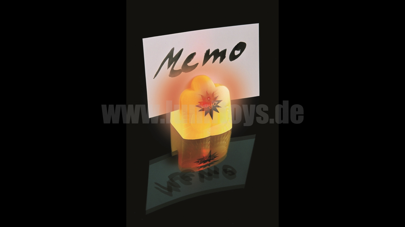 Memo-holder with LED, activates when message is put in. Different colours and shapes available, extra print possible on request.