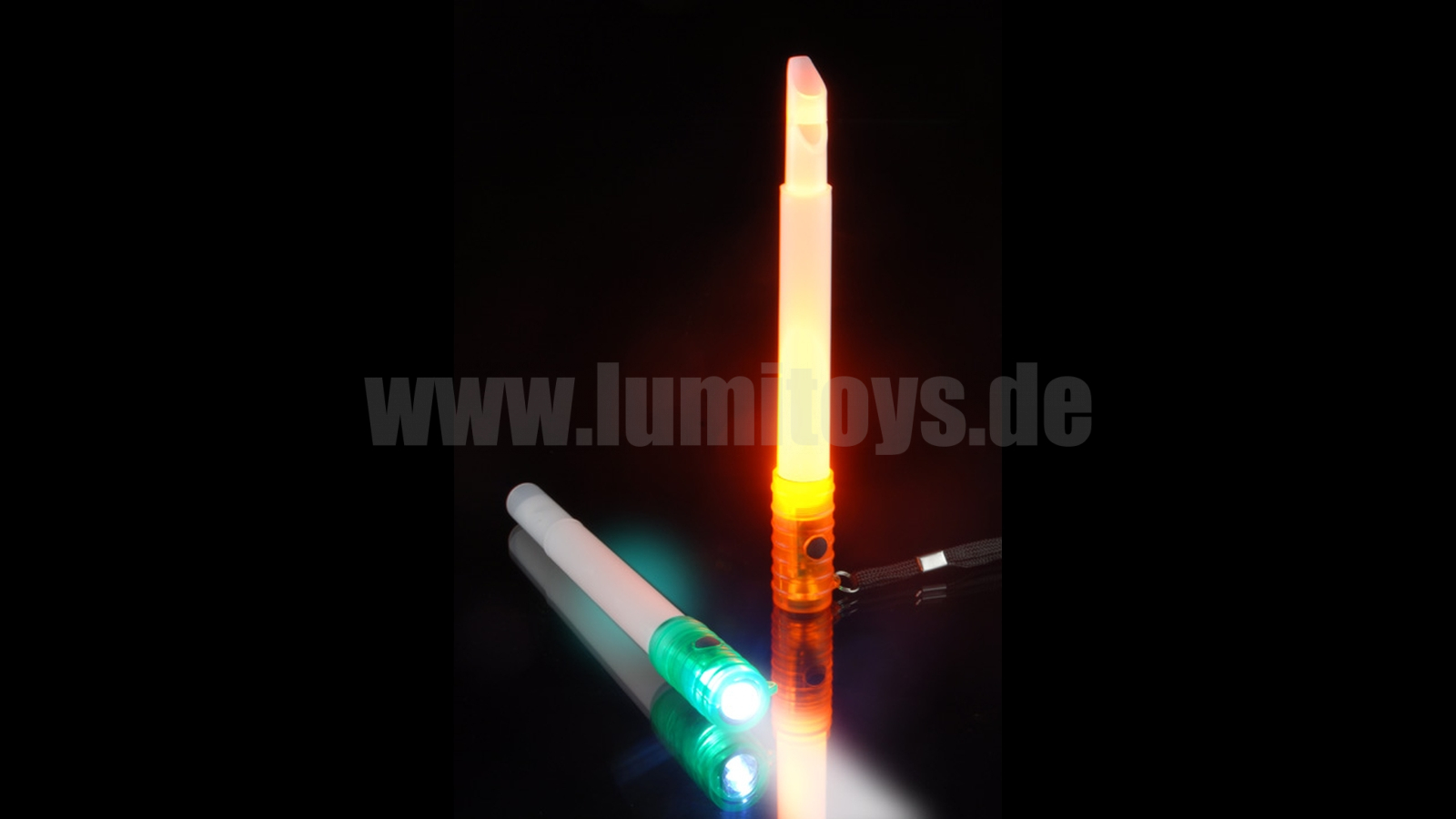 Pocket Stick with various flashing functions, additional lamp in handle, extra whistle and necklace. Assorted colours, inc. 3x AG13 batteries (spare: item 1945). Individual colours possible on request.