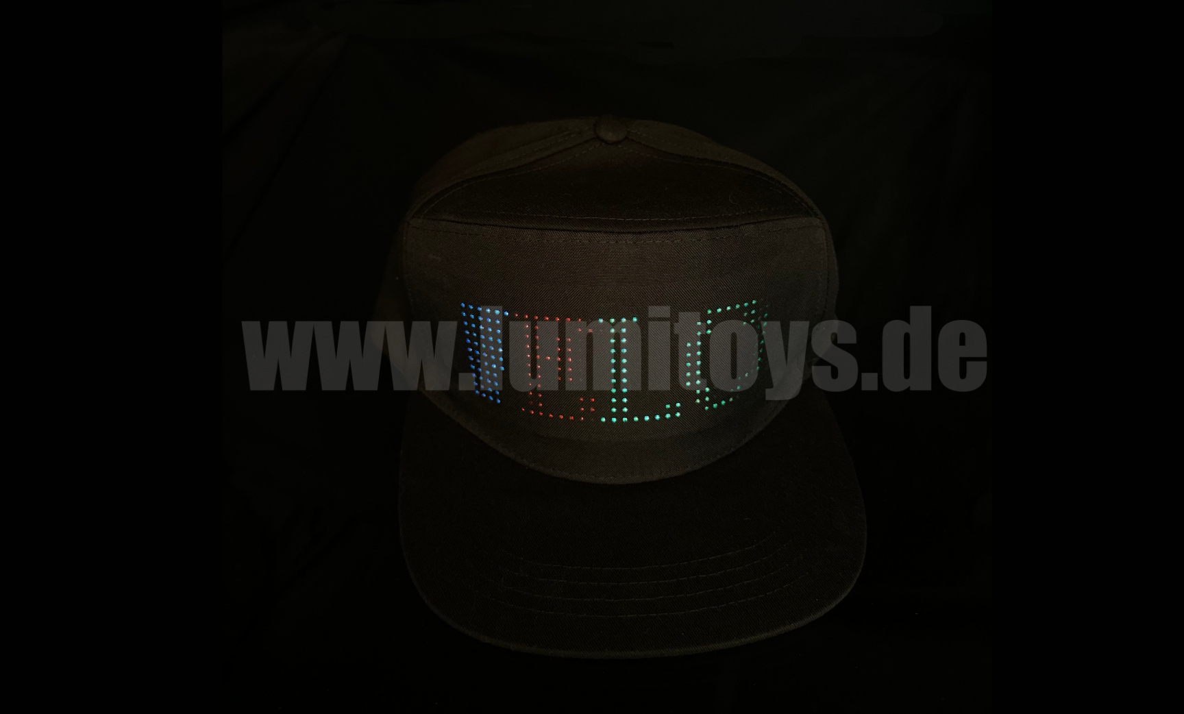 Größenverstellbares Basecap mit LED-Laufschrift, über Bluetooth/App selbst programmier- und steuerbar. Texte, eigene Artworks und einfache Animationen können programmiert werden, Laufgeschwindigkeiten, LED-Farben usw. werden ebenfalls über die App gesteuert. Über USB aufladbar, Stoff in verschiedenen Standardfarben erhältlich, Sonderfarben sind auf Wunsch möglich.