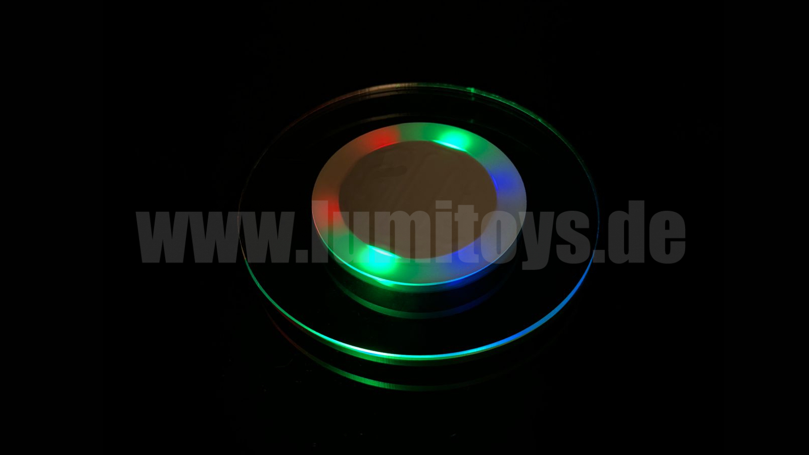 Klarer Untersetzer mit fantastischem Rainbow-Lichteffekt, verschiedene Blinkmodi auf Knopfdruck anwählbar. Individuelle Bedruckung möglich.