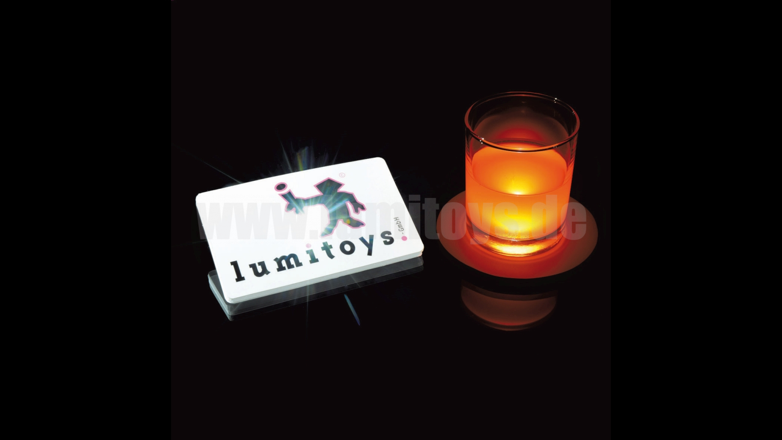 Untersetzer aus PU-Schaum mit einzelner High-Power LED, diverse LED-Farben erhältlich, eigene Gehäusefarben und -formen realisierbar. Optimale Fläche für individuellen Druck.
