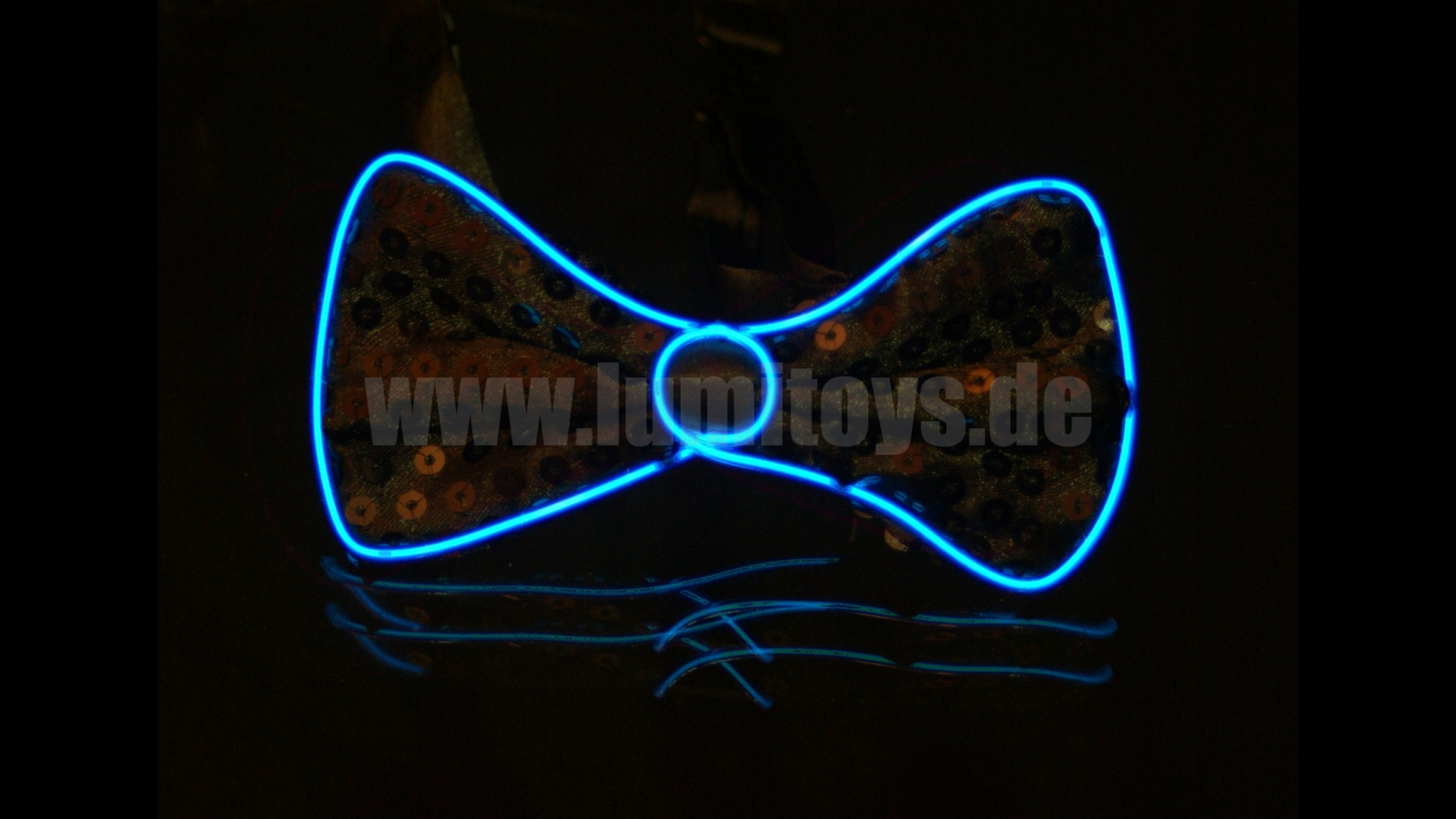 Paillettenbestickte Fliege mit drei verschiedenen Blinkfunktionen, in verschiedenen Leuchtfarben erhältlich. Größenverstellbares Band mit Schnellverschluss zum einfachen An- und Ablegen, 2x 1,5V Mignon Batterie erforderlich (Art.Nr. 1921).