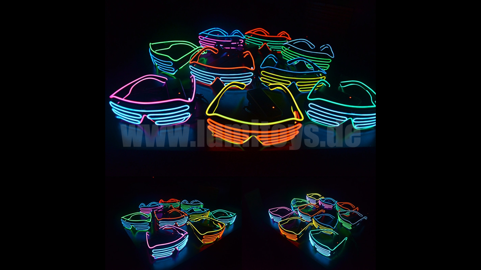 Brille mit EL-Technik in zahlreichen Farben, verschiedene Blinkprogramme per Schalter anwählbar. Optional mit Soundsteuerung erhältlich. 2x 1,5V Mignon Batterie erforderlich (Art.Nr. 1921).