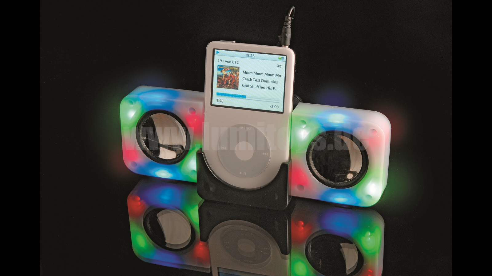 Batteriebetriebener Lautsprecher mit Lichtorgel-Funktion. Mit passendem Anschluss für CD- oder MP3-Player (nicht im Lieferumfang enthalten)