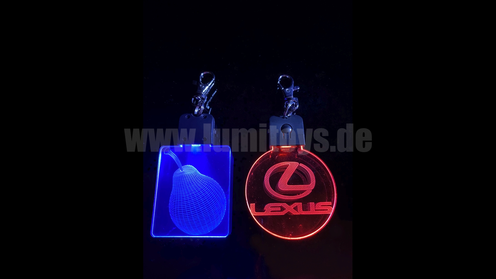Ultraleichter Schlüsselanhänger im 3D-Effekt in individueller Form und mit eigener Gravur. Zweifarbige LEDs, diverse Farben erhältlich. Ebenfalls verschiedene Standard-Modelle lieferbar, zusätzliche individuelle Bedruckung ist möglich.