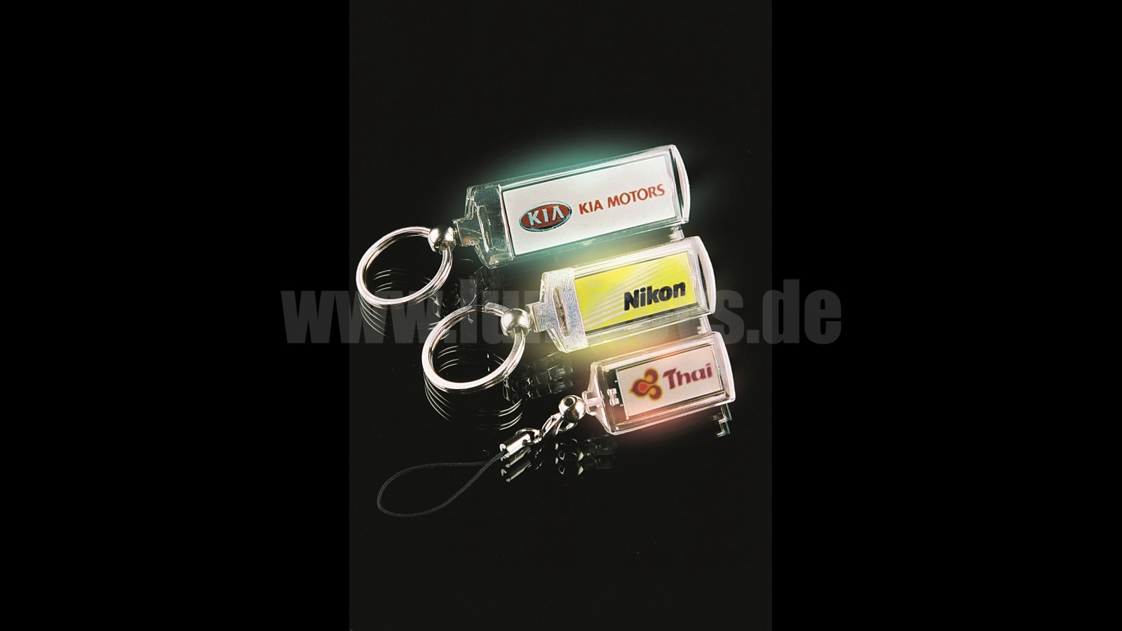 Schlüsselanhänger mit individuellem Logo, wahlweise fest installiert oder austauschbar, eigene Bestückung möglich. Erhältlich in verschiedenen Formen, auch mit Uhr, Morphing oder USB-Stick, Karabiner oder Band. Standard-Modell mit austauschbarem Text ab Lager lieferbar. Mit Solarzelle, keine Batterie erforderlich!