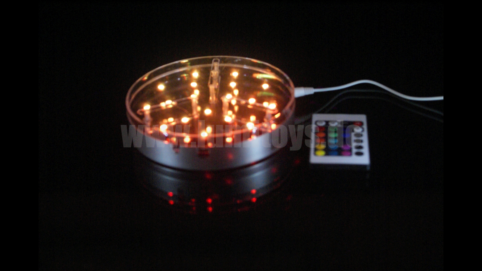 Großer Untersetzer mit RGB-LEDs, bietet 16 verschiedenen Leuchtfarben in 4 verschiedenen Blinkmodi. Die Steuerung erfolgt über Fernbedienung, Betrieb über eingebaute Akkus/Netzteil, alternativ Batteriebetrieb möglich.