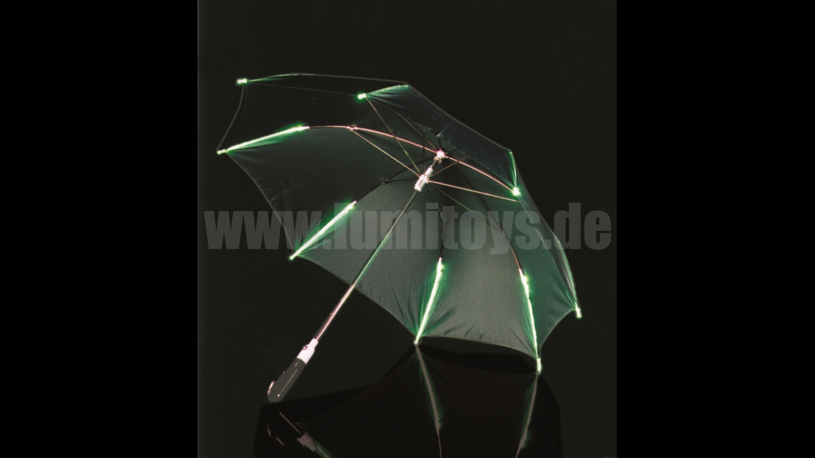 Regenschirm mit LEDs als zusätzliches Sicherheitsplus, einfarbige oder bunte LEDs, verschiedene Blinkmodi. Individuelle Stoff- und Leuchtfarben, auch mit transparenter Bespannung, zusätzliche Bedruckung auf Wunsch möglich.
