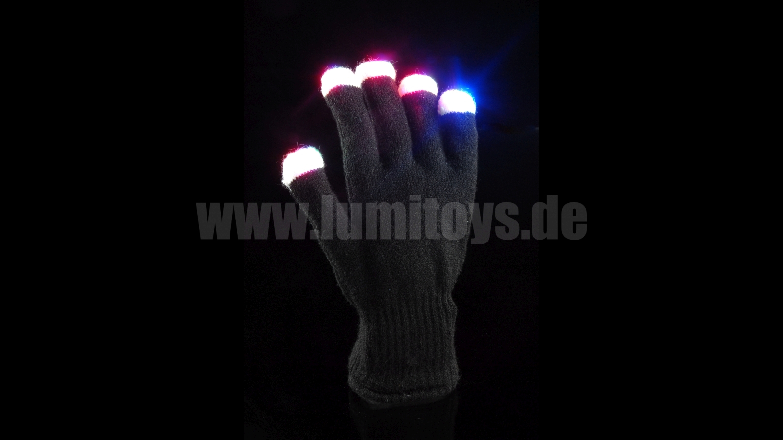 Weißer oder schwarzer Fünffinger-Handschuh mit bunten LEDs in den Fingerspitzen, verschiedene Blinkfunktionen. Erwachsenen-Größe, Kindergrößen auf Wunsch lieferbar. Lieferung erfolgt incl. 3x AG13 Batterien (Ersatzbatterie: Art.Nr. 1945).