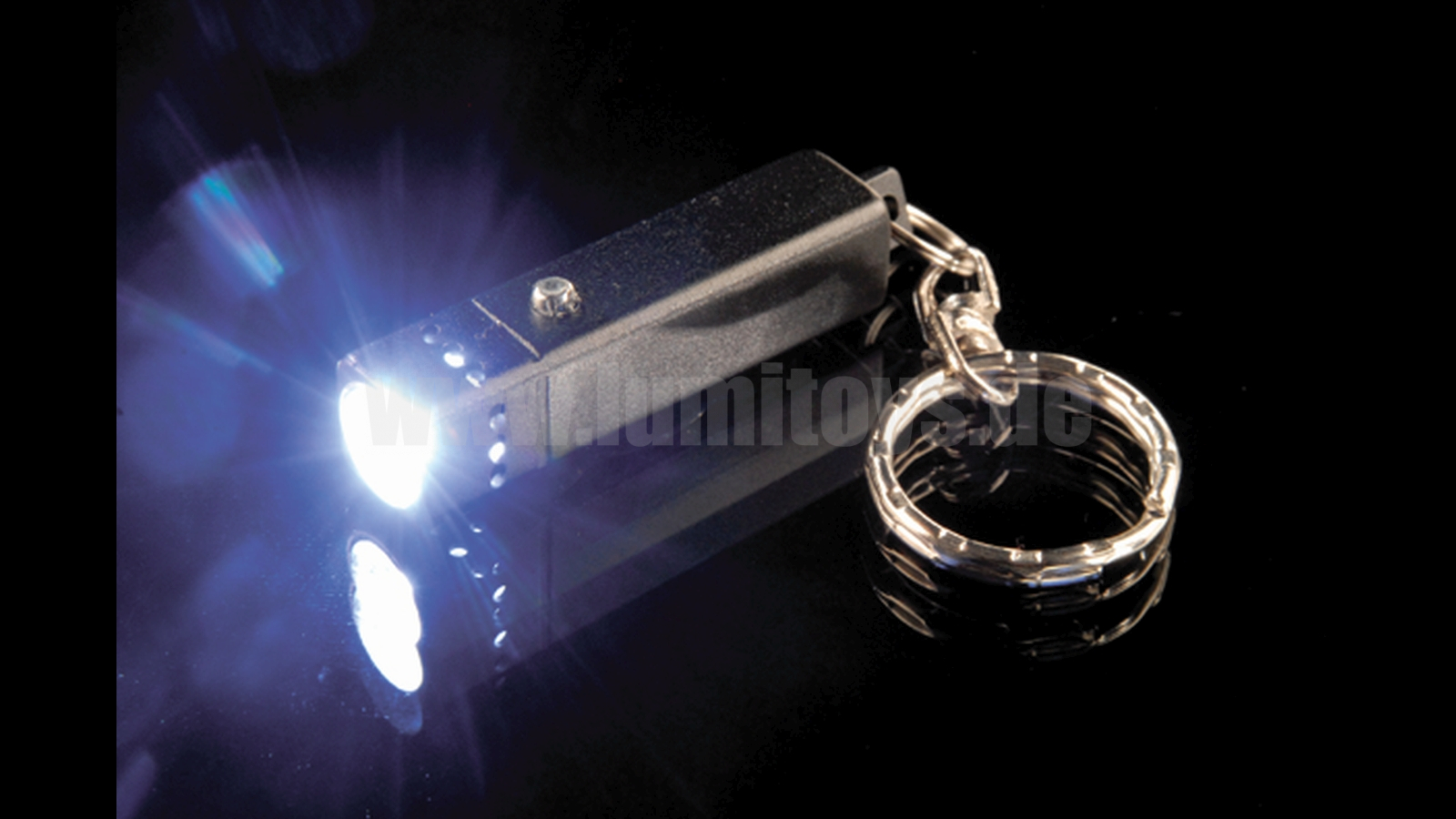 Mini-Lampe mit Schlüsselanhänger oder Karabiner, in verschiedenen Farben erhältlich. Zusätzliche Bedruckung möglich.