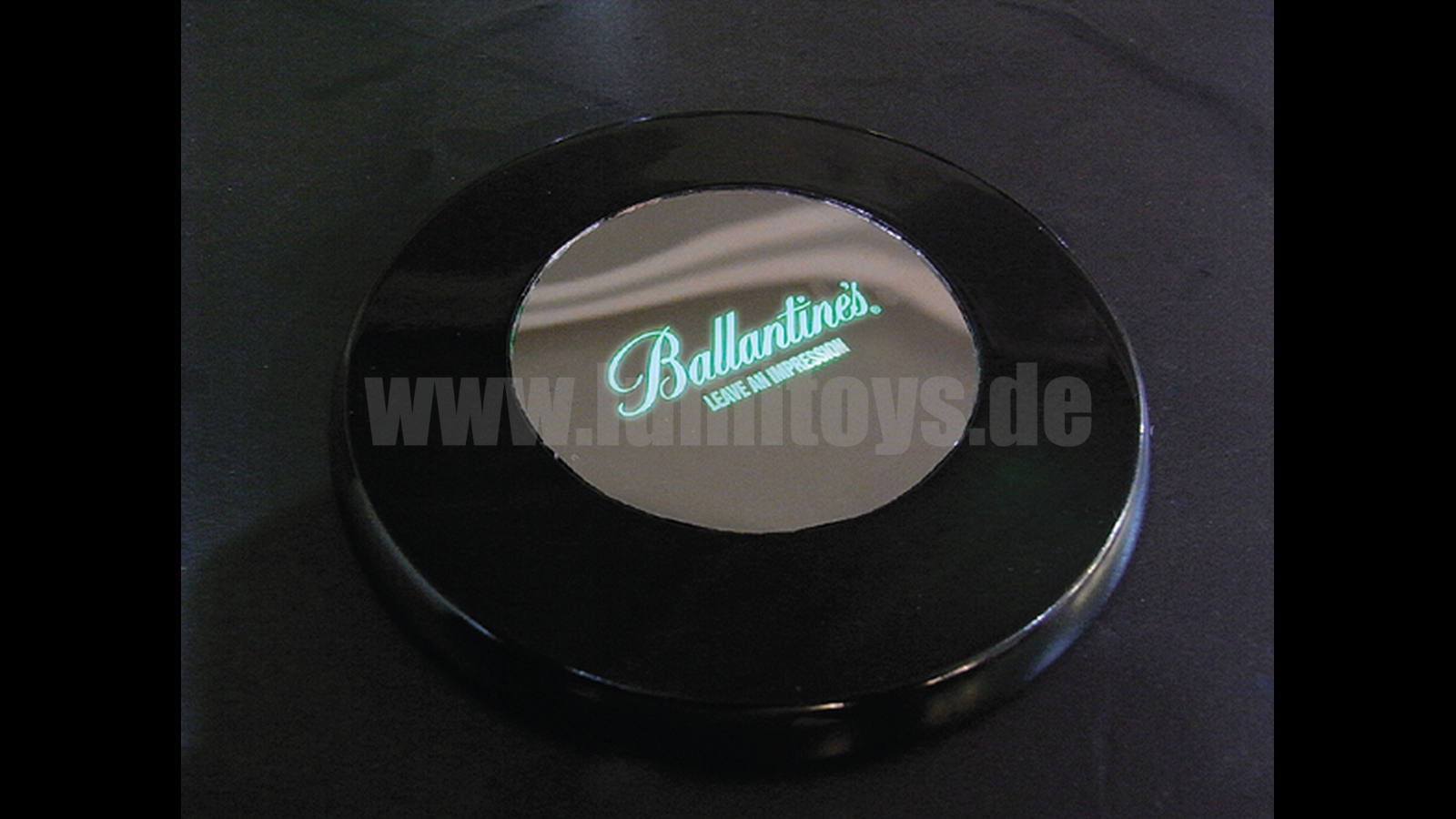 Verspiegelter Untersetzer mit individuell gestaltbarem LED-Logo, wird beim Absetzen des Glases aktiviert. Zusätzlicher Druck möglich.