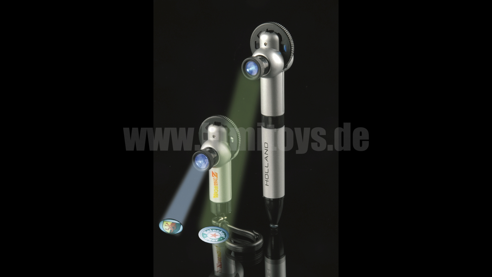 LED-Beamer mit bis zu 8 verschiedenen individuellen Bildern, wahlweise als Schlüsselanhänger oder Kugelschreiber. Druck auf Wunsch möglich.