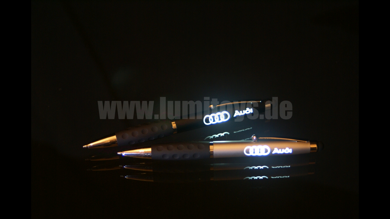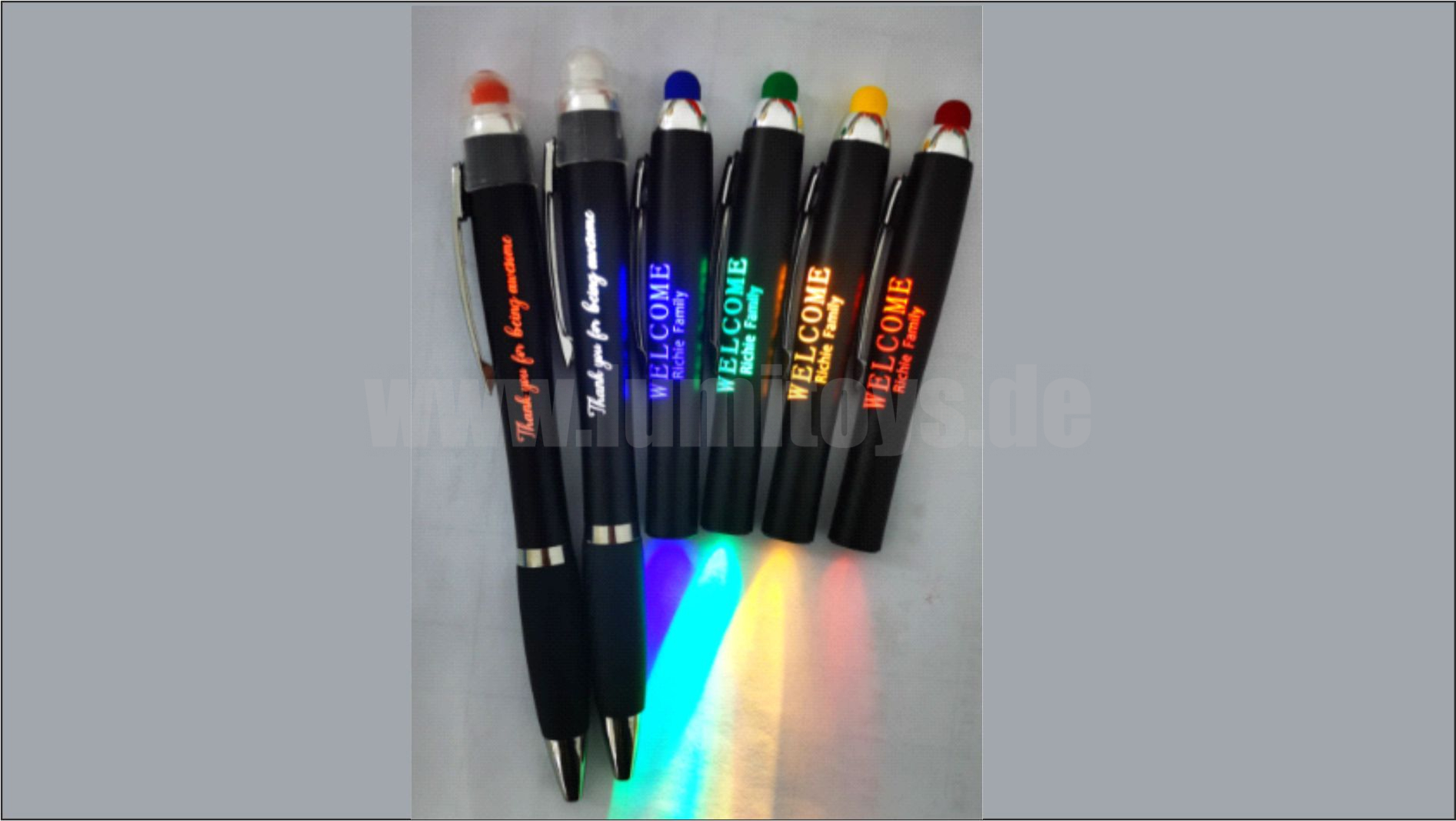 Leuchtende Kugelschreiber mit oder ohne Stylus in verschiedenen Ausfertigungen, mit leuchtender Gravur, individueller Bedruckung, eigenem Inlay oder neutral. Verschiedene LED- sowie individuelle Gehäusefarben möglich.
