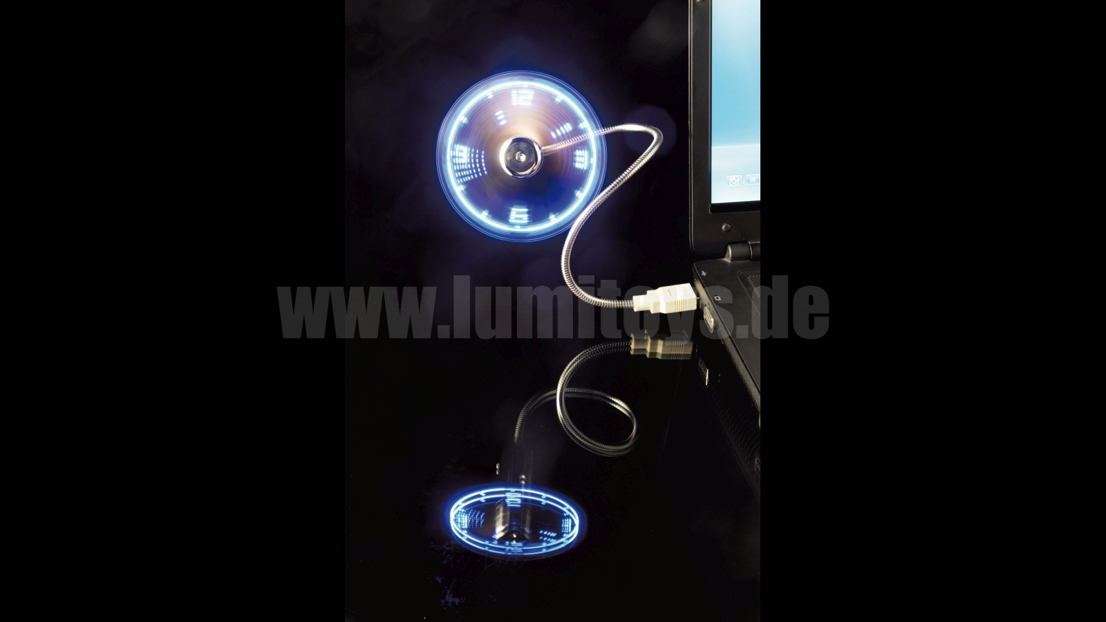 Miniventilator mit individueller, unveränderbarer Programmierung und aktiver Zeitanzeige, USB-Anschluss. Verschiedene LED- und Gehäusefarben sowie zusätzliche Bedruckung möglich.