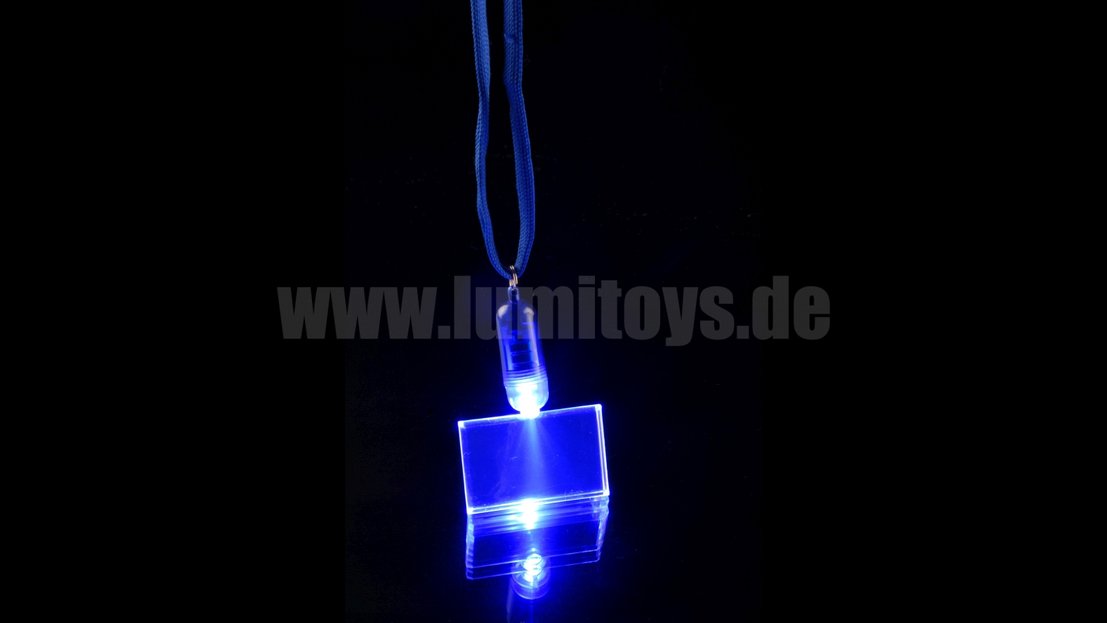 Anhänger austauschbar, erhältlich als Rechteck, Kreis, Herz und Stern. Sonderformen auf Wunsch möglich. Drei Blinkmodi, verschiedene LED-Farben lieferbar, Textil-Lanyard. Lieferung erfolgt incl. 3x AG3 Batterien (Ersatzbatterie: Art.Nr. 1941)